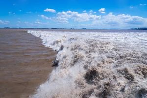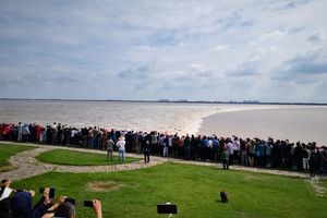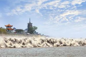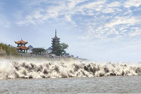 潮頭會在這里呈一道白色水線,以驚人的速度奔向堤岸。隨著白線的逐漸升高,潮頭好像一排銳不可當的白墻,氣勢磅礴非常好看。