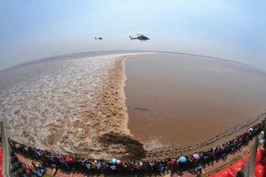 潮頭會(huì)在這里呈一道白色水線,以驚人的速度奔向堤岸。隨著白線的逐漸升高,潮頭好像一排銳不可當(dāng)?shù)陌讐Γ瑲鈩?shì)磅礴非常好看。