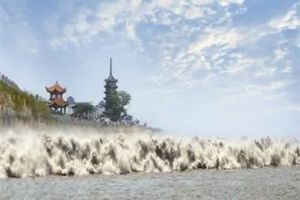 鹽官位與河槽寬度向上游急劇收縮之后的不遠(yuǎn)處,東、南兩股潮交會(huì)后剛好成一直線,潮能集中,潮頭特別高,通常為1—2米,有時(shí)可達(dá)3米以上,氣勢(shì)磅礴,潮景壯觀,造就了海寧潮是觀賞一線潮的最佳位置。