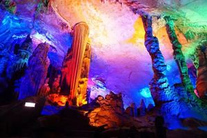 洞口有小木船穿梭往來,坐上小木船,緩緩駛?cè)攵囱ǎ囱íM窄,只容兩只木船進(jìn)出。進(jìn)入洞中,借著五彩燈光,可見兩旁斷巖絕壁,形狀各異的石鐘乳。